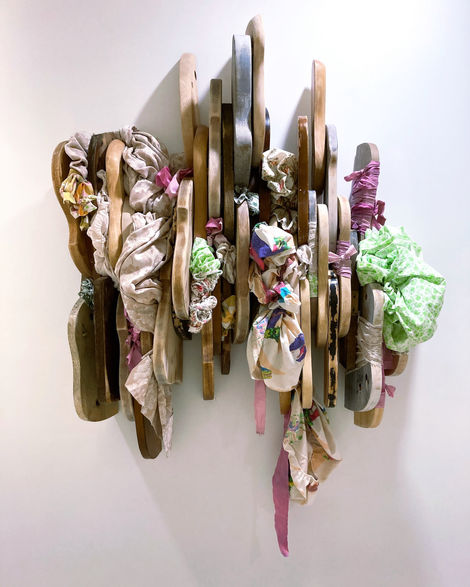 Assembled cut chairs seats w/stuffed, cut, and wrapped bedsheets.